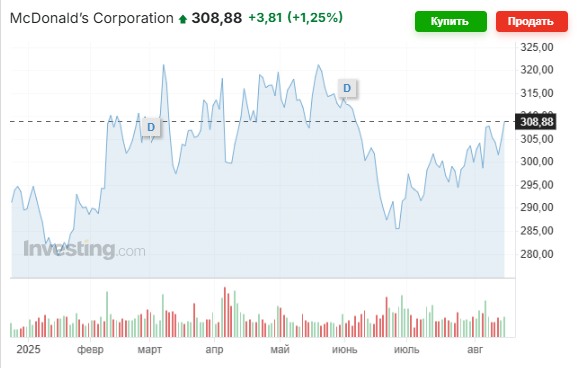 McDonald’s stock ($MCD) is currently trading at $308.88, up +1.25% for the day and continuing its gradual recovery after the June dip.
